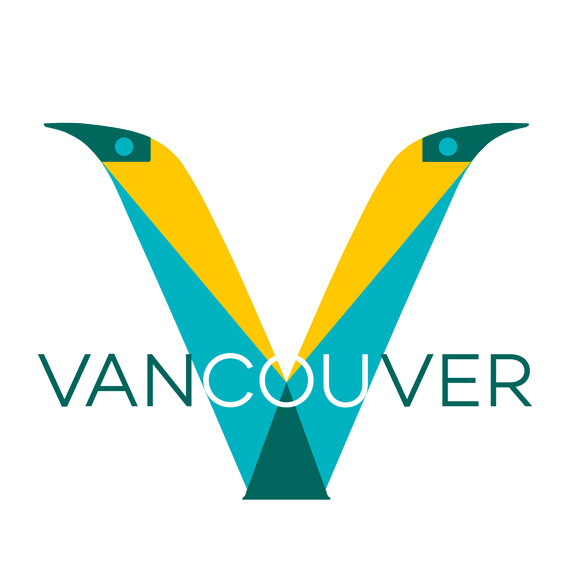 Our new design depicts Vancouver in a bold, geometric type based on the Campton font. The "V" includes a pair of yellow feathers rising from the lower triangle in the "V", which denotes Vancouver's green towers and trees. The green base continues throughout the word and outlines the elevation from the city on the left going north (right) to the mountains.