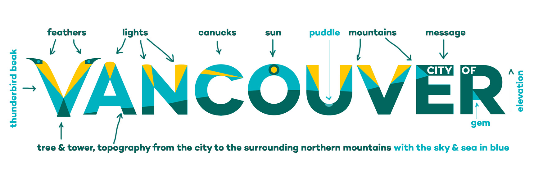 The lightshows held in the city inspired the geometric designs within the type used for the proposed new Vancouver logo. The breadth of the letters allows for superposition of many other colours and patterns to depict the diversity of cultures and feelings in the City.